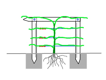 Для сортов, отличающихся большой силой роста, лучше иметь шпалеру с 4-мя ярусами проволоки.