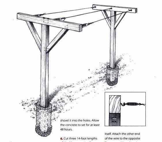 Для устройства шпалеры по краям участка устанавливаются деревянные, железные или железобетонные столбы (рис. 93).