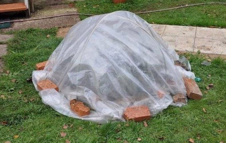 Далее с помощью веревки растение необходимо зафиксировать и сверху накрыть сухими листьями, опилками или лапником. Укрывной материал можно придавить камнями или кирпичами. Затем конструкцию необходимо укрыть спанбондом, а сверху набросить пленку.