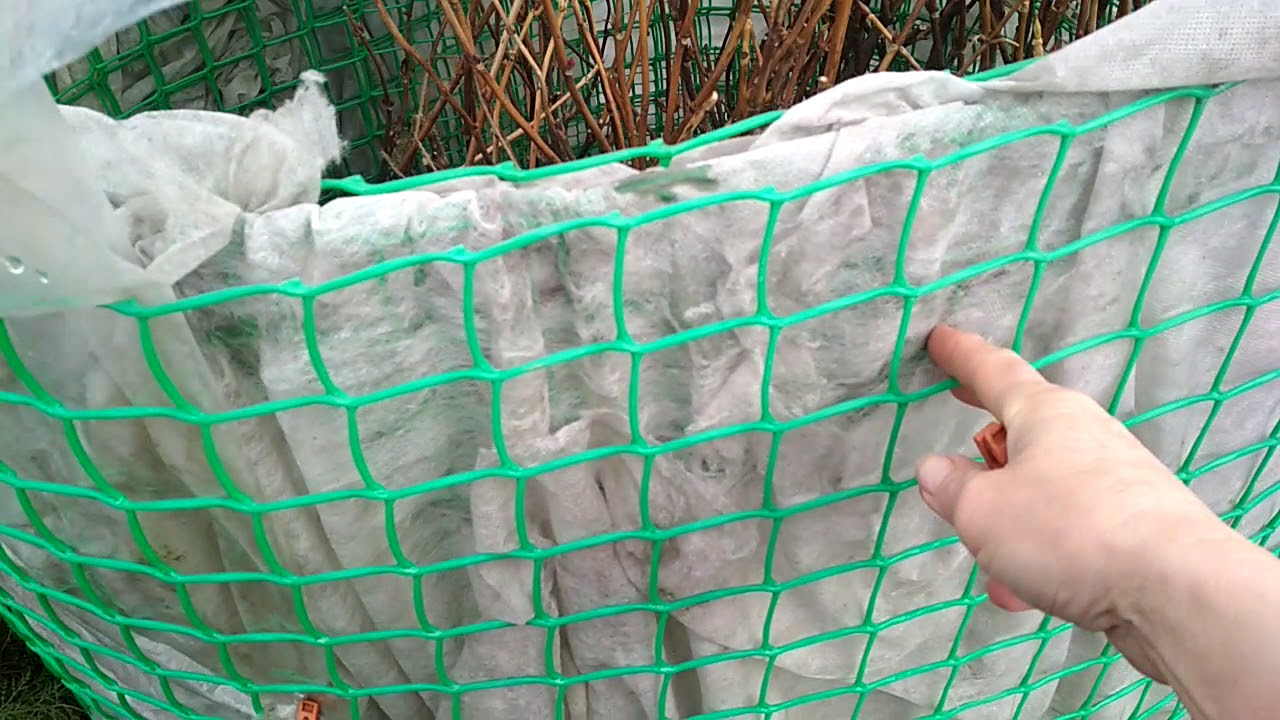 Наибольшую популярность среди садоводов получил воздушно-сухой метод укрытия. Сначала куст нужно обмотать спанбондом. Затем на расстоянии 25 см вокруг куста поставить каркас из металлической сетки.