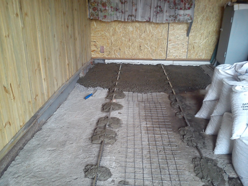 Если дача только построена, и основанием для полов служит цементная стяжка, ее достаточно подмести. Лаги в этом случае делают самостоятельно из бруса 100х150 мм или прочных досок сечением 100х50 мм. Древесина должна быть обязательно ровной, хорошо просушенной, без дефектов. Перед установкой лаги нужно прогрунтовать, а основание застелить рубероидом.