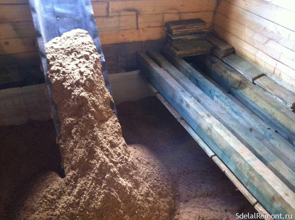 Рулонные утеплители обрезают непосредственно при укладке. Если используются опилки, их необходимо обработать антипиреном и смешать с известью, объем которой должен составлять около 10% от объема опилок. Известь помогает защитить утеплитель от мышей, а пропитка антипиреном снизит горючесть материала. После этого опилки необходимо хорошо просушить на воздухе.