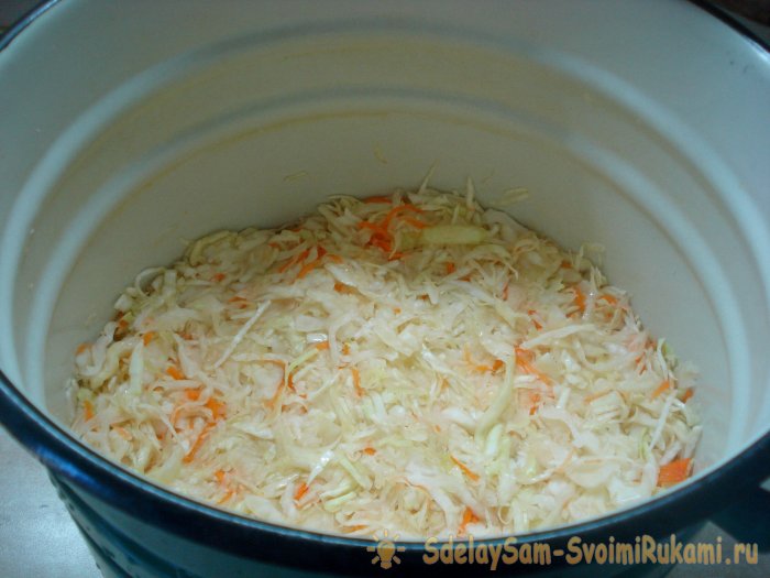 - Хорошенько мните капусту с морковью. Так овощи пустят сок и добавят хрустящести готовому блюду.