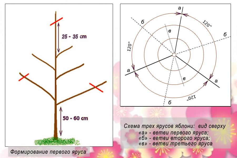 Первая обрезка яблонь проводится сразу после их посадки на основное место. Если у деревца нет боковых побегов, у него укорачивается верхушка для образования будущих скелетных ветвей.
