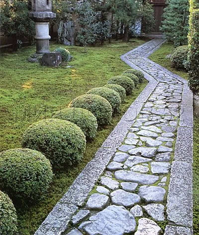 Дорожки создаются из гладких камней или плоских валунов. Они укладываются в один ряд или несколько. Варианты использования валунов для садовых тропинок представлены на фото.