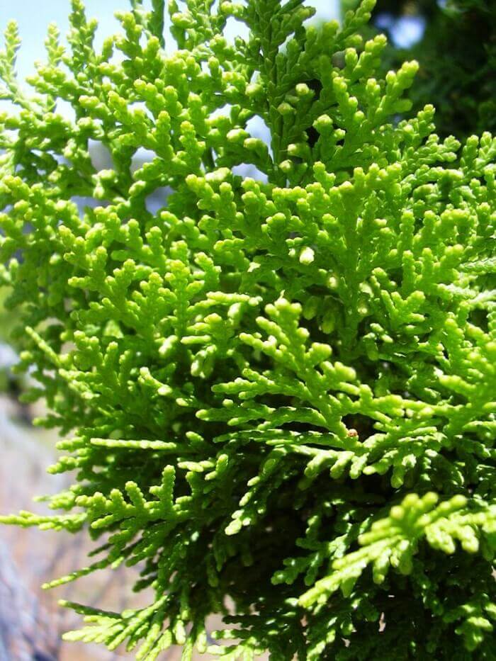 Высаживается в качестве фона в альпинарии, используется в топиарных композициях. Ядовитое растение применяется в классической гомеопатии. - Туя. Растение с богатой цветовой палитрой хвои (голубой, желтой, зеленой). Это позволяет подобрать его для любой ландшафтной композиции. Туя светолюбива, не все виды устойчивы к морозу. Хорошо переносит стрижку, ее часто высаживают вдоль аллей и в живые изгороди.