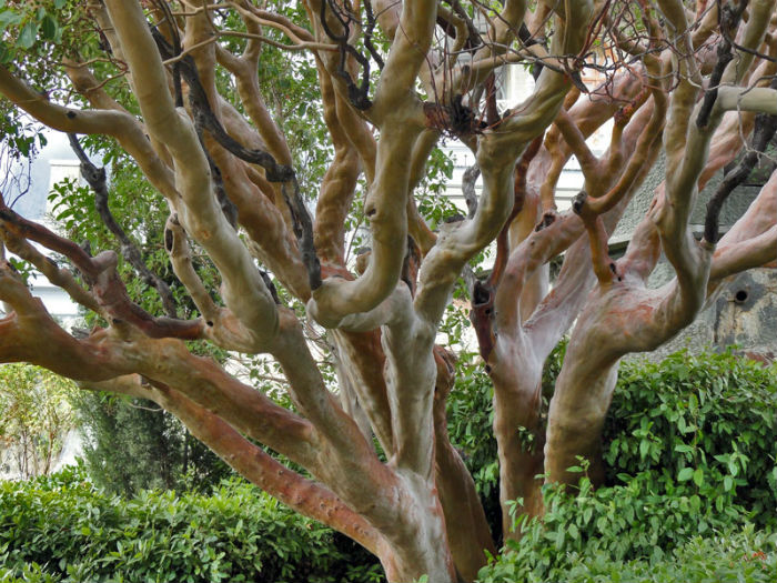 - Самшит. Небольшое дерево (10−12 м) с мелкими плотными листьями. В пазухах листьев расположены мелкие белые цветы, собранные в виде колоска. Блестящая листва самшита очень декоративна. Дерево высаживают в парках для обрамления дорог, стрижкой самшиту придают различные причудливые формы. Дерево растет медленно, долгое время сохраняет свою форму.