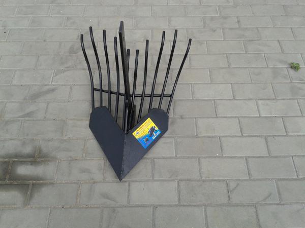Такая картофелекопалка для уборки урожая со стальными стрелами-прутами является одним из самых простых механизмов. Устанавливают ее на маленькие тракторы или мотоблоки. Изготавливается легко, по аналогии со штыковой лопатой. Делают ее из изогнутого особым способом металлического листа и нескольких приваренных к нему веером прутьев, для отсеивания почвы. Средние размеры копалки: высота – 500 мм, ширина – 330 мм, масса – 5,5 кг.