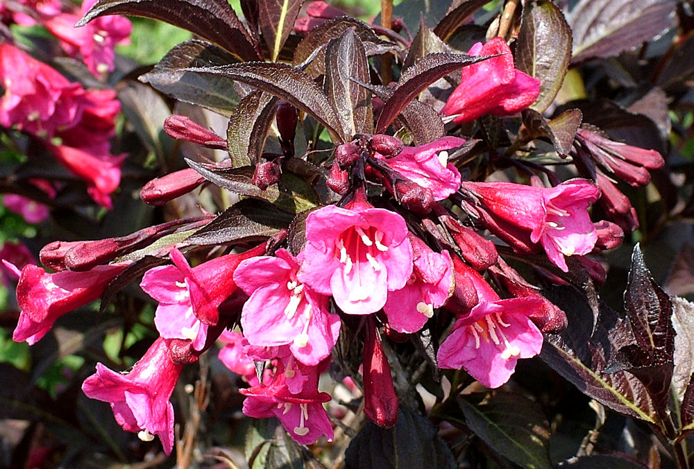 Вейгела старинная Menuet ( Weigela florida «Минуэт»):Этот сорт вырастает всего от 2 до 3 футов в высоту и ширину, а скорость роста ниже, чем у этого вида. Выносливая, компактная, карликовая форма с темно-рубиново-красными трубчатыми цветками с лилово-фиолетовыми лепестками и желтым горлом. Цветки слегка ароматные. Листья темно-зеленые с пурпурным оттенком.
