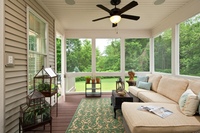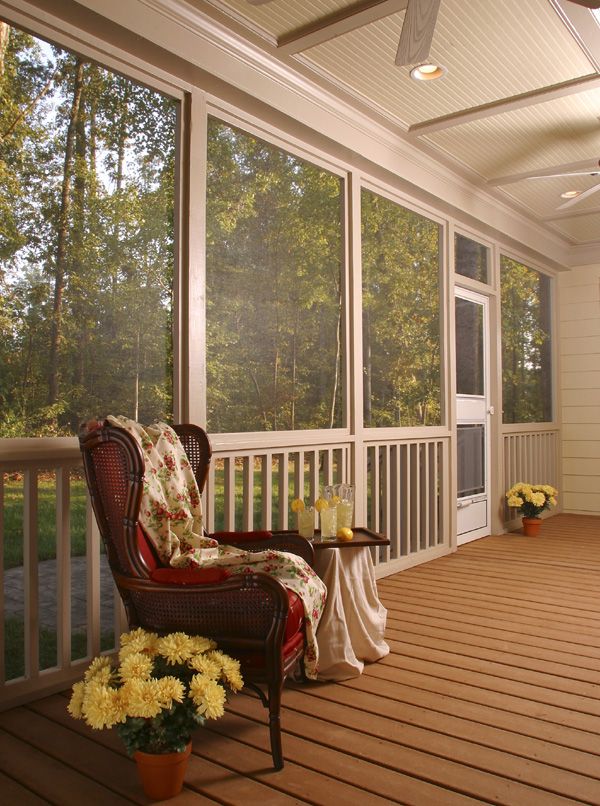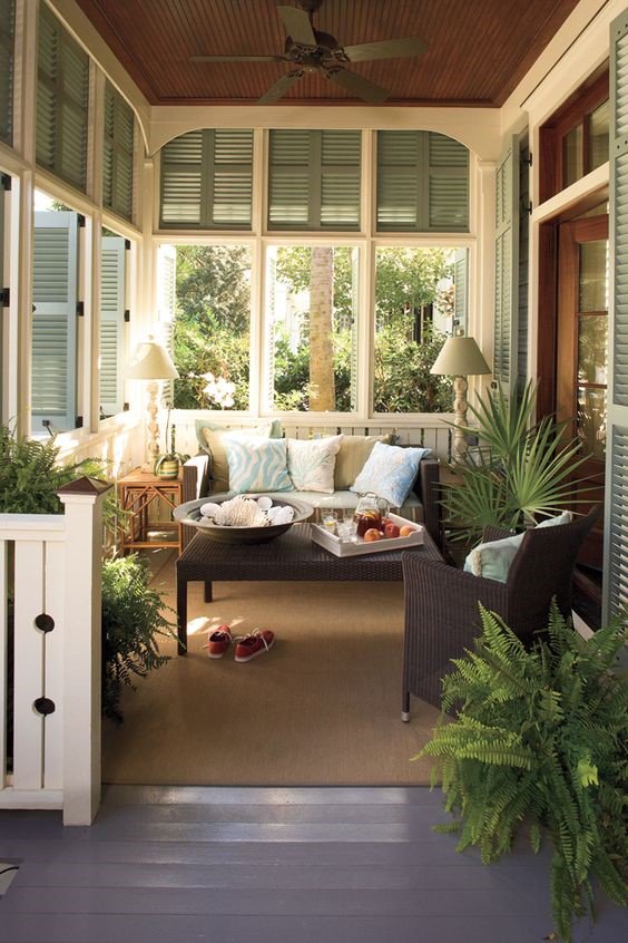 Веранда закрытого вида выступает в качестве места для расслабления и отдыха. Потому стоит надежно защитить ее от непогоды, сделать теплым и соответствующим по стилю общему виду дома. Откажитесь от хай-тек. Он слишком «холодный» для подобного помещения. Используйте больше натуральных материалов, живых растений и мебели из древесины.