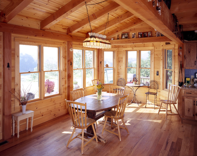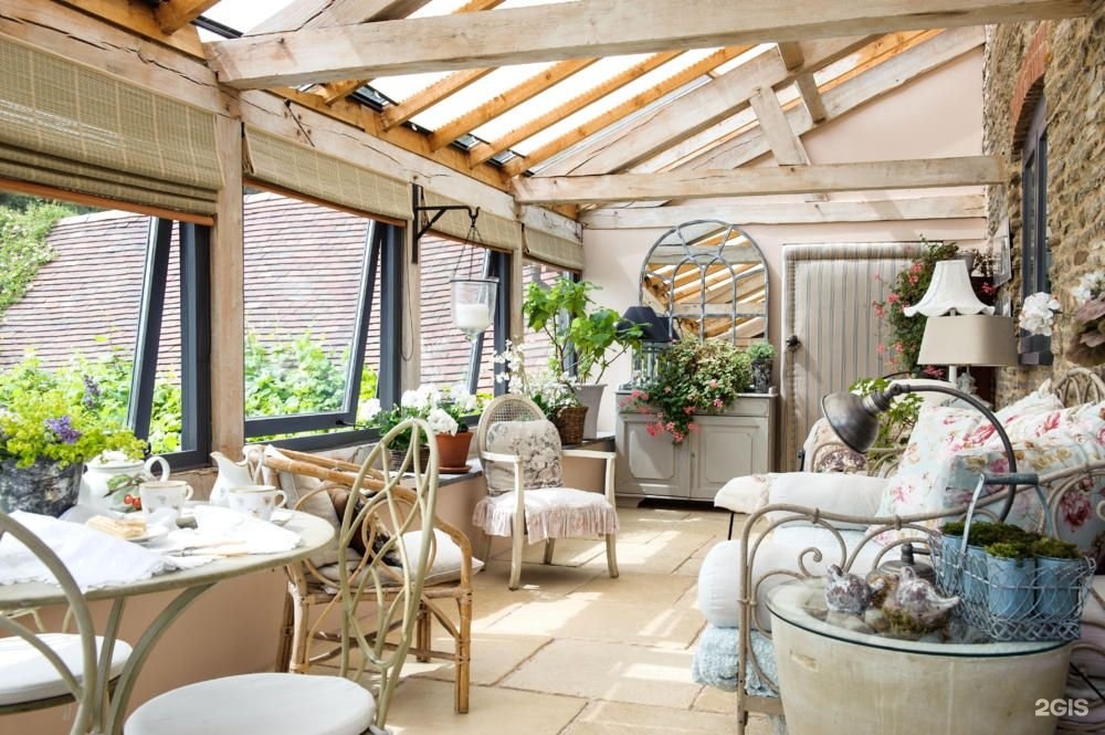 Восточные и южные конструкции оформляются преимущественно в стиле прованс. На потолке располагаются деревянные балки, мебель только из натуральных материалов. Стулья и стол, много цветов, размещенных в вазах, служащих дополнительным элементом украшения.