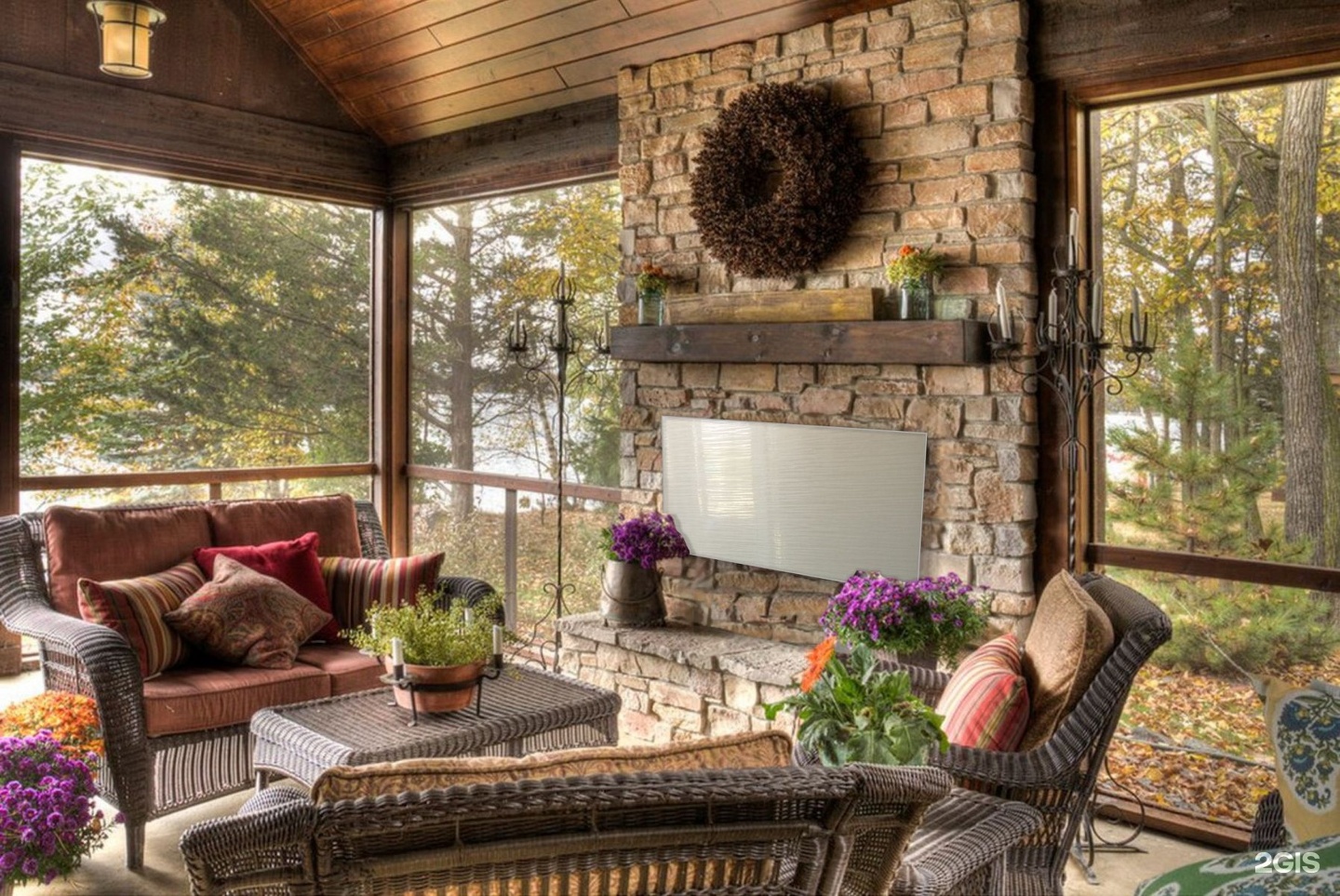 Камин уместен как на открытой террасе, так и в закрытой веранде