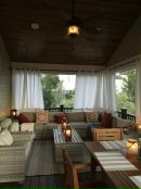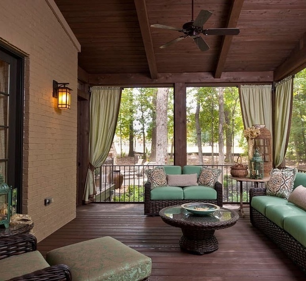 | Шторы | Дополнить оформление можно прозрачными занавесками, создающими атмосферу воздушности. Есть специальные шторы из акрила пригодные для улицы. Они способны отталкивать грязь и пыль. Подходят занавески из бамбука или рулонные модели. Эта деталь дизайна не обязательна при оформлении веранды, но если владельцы дома желают украсить конструкцию рекомендуется использовать перечисленные варианты. |