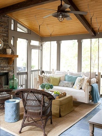 | Мебель | Зависит от типа веранды. Закрытый вид можно обустроить как обычную домашнюю комнату. Открытый тип предполагает использования террасы только в хорошую погоду. Потому разумно размещать складные изделия. Если погодные условия резко изменятся, удастся быстро собрать конструкции. Выбирайте модели из искусственного ротанга. Отличаются привлекательным внешним видом, не портятся от сильного ветра, воздействия влаги или солнца. Можно поместить диван, несколько подвесных кресел. Плетеная мебель отлично подойдет для веранды. |