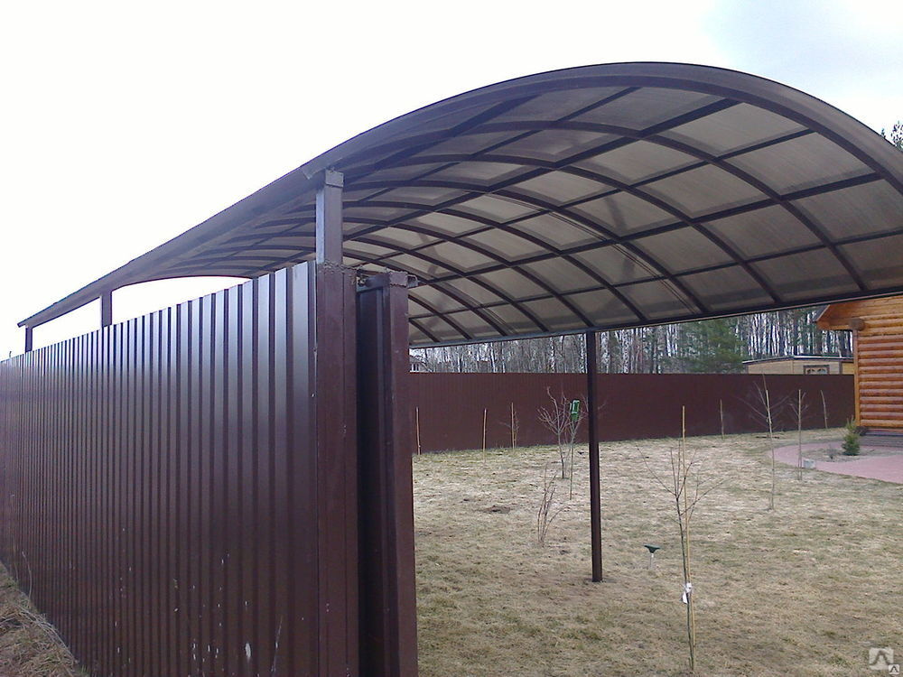 В отличие от стекла и пластика, этот материал удобен в работе. Края изделия оснащены ребрами жесткости, благодаря чему листы можно сгибать без плохих последствий. Поэтому предоставляется возможность сооружать навесы любых плоскостей, даже полукруглых. Другое достоинство материала в разнообразной окраске. Плюс ко всему, прозрачность материала усиливает освещение закрываемого участка.