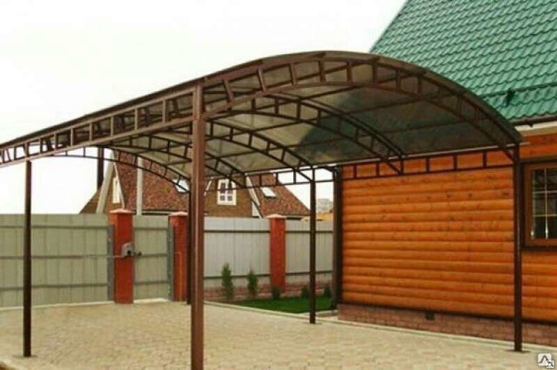 Для такого навеса хорошо подойдет сотовый поликарбонат, вы сможете придать оригинальную форму навесу и подобрать цвет, который будет гармонировать с общей цветовой гаммой дома.