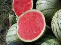 - Холодок. Данный сорт отличается хорошей транспортабельностью и лежкостью плодов. Сочная ягода красного цвета имеет крупные коричневатые семена с крапинами. Плоды круглые, насыщенно зеленого окраса, с темными полосами неопределенной формы. Куст отличается сильным вегетативным развитием. Его мощные плети разрастаются на 4-5 м. Срок созревания арбузов – 2,5-3 месяца, масса плода может достигать до 5 кг.