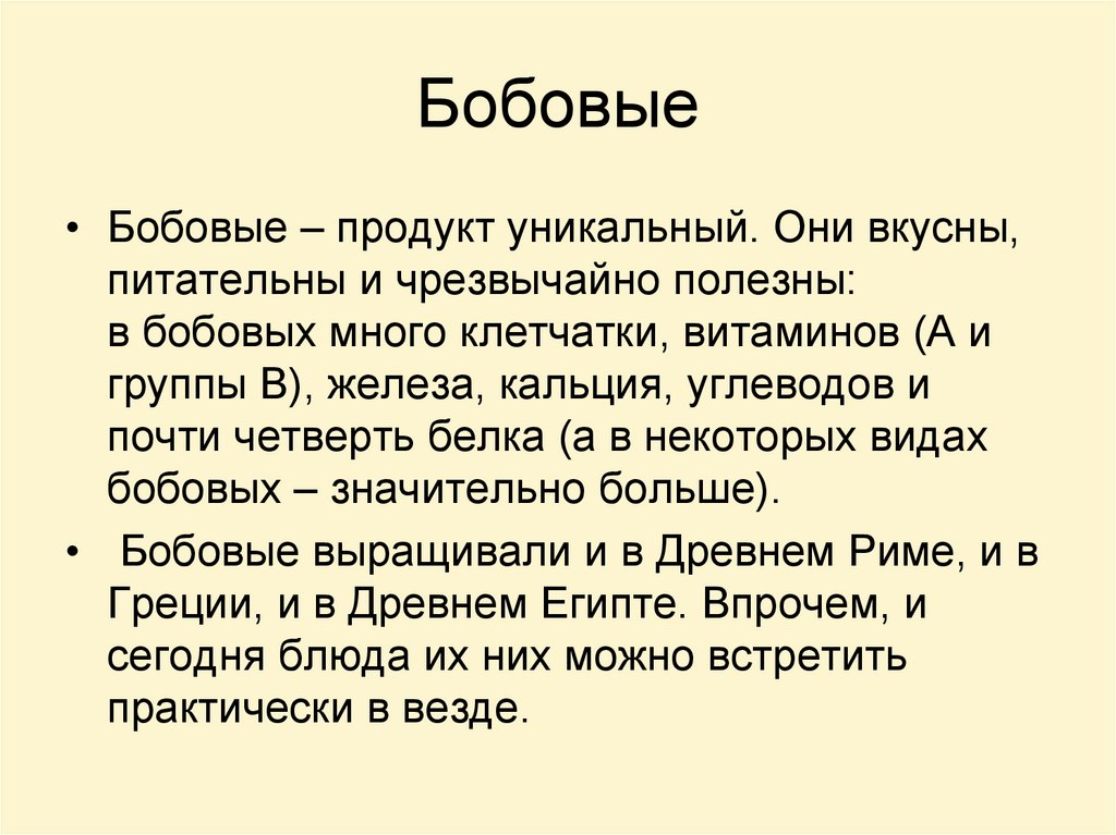 | Фава-бобы | 187 ккал | 33,4 | 9,2 | 0,7 | 12,9 |
