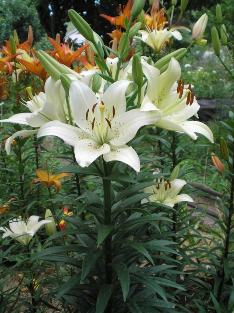 Цветки с сильным ароматом имеют трубчатую форму и склонны смотреть в сторону. За исключением зеленоватого оттенка у основания внешних лепестков, цветы полностью белые. Эти растения лучше всего растут на известковых почвах. Большинство садовых лилий, предлагаемых на рынке как выносливые, относятся к группе гибридов азиатских лилий. Они достигают высоты до одного метра и образуют несколько звездчатых цветков, которые распускаются с июня или июля. Солнечное или полутенистое место со свежей, богатой гумусом, питательными веществами и проницаемой почвой является лучшим для зимостойких лилий. Вот несколько особенно крепких сортов: