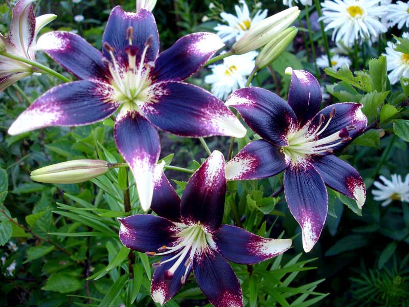 - ‘Eyeliner’ : изящные белые цветки с лиловыми крапинками и каймой; время цветения: июнь – июль; высота до 60 см