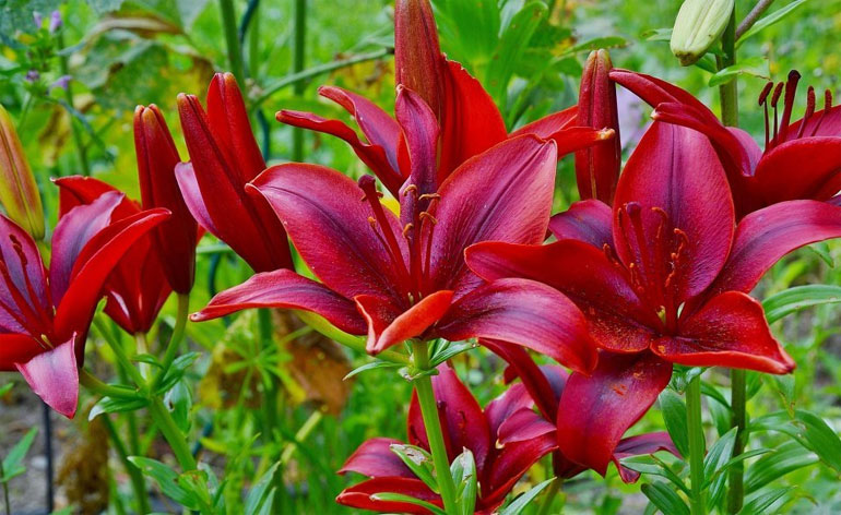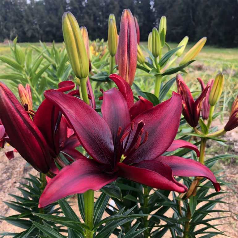 - ‘Avignon’ : азиатская гибридная лилия с ярко-красными цветками; время цветения: май – июль; высота до 60 см высотой