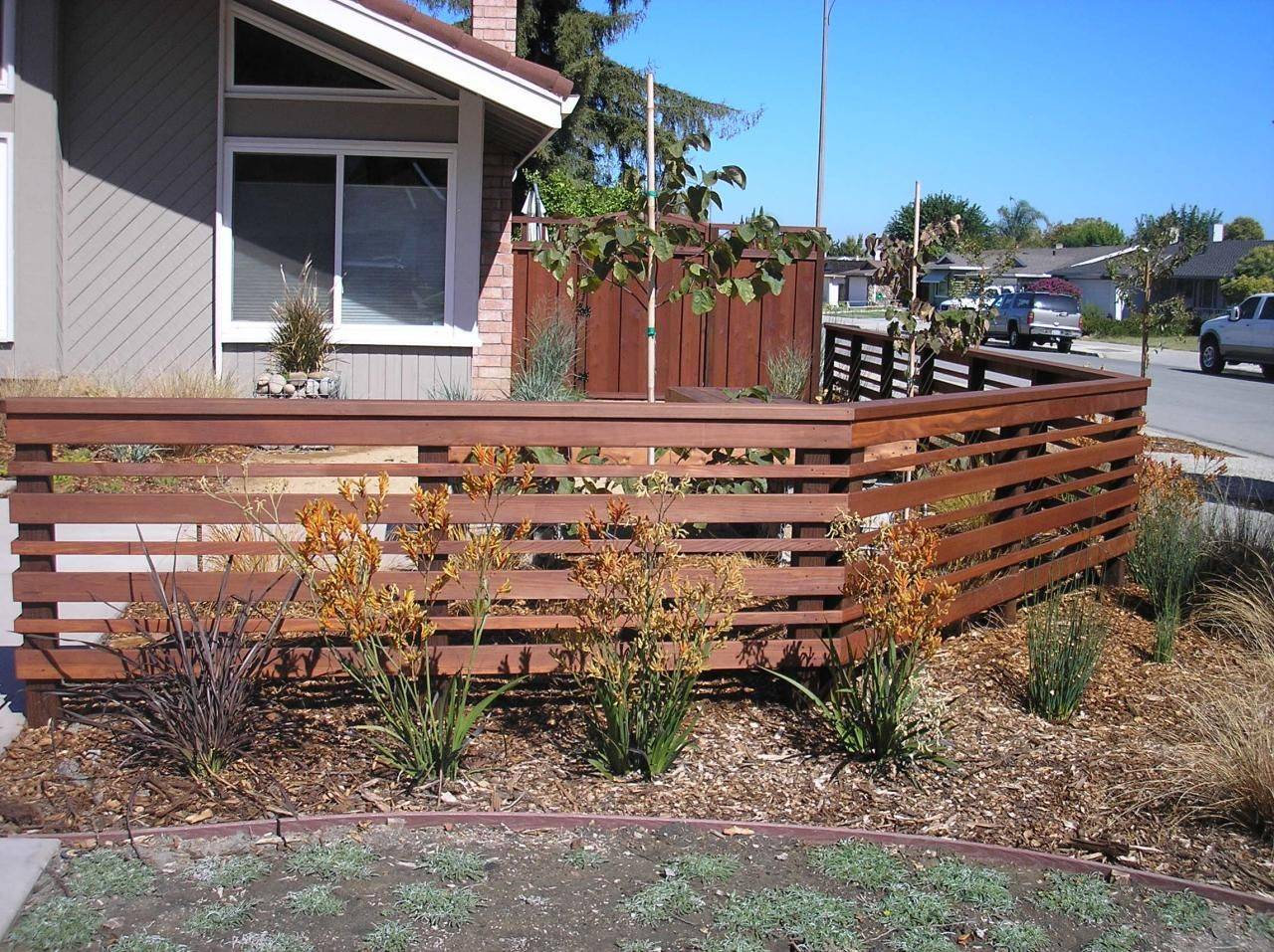 Не менее популярен брус, представляющий собой распил досок, которые крепятся к опорным столбам горизонтально. Обычно брус используют в тех палисадниках, где помимо красоты требуется защита растений от постороннего влияния.