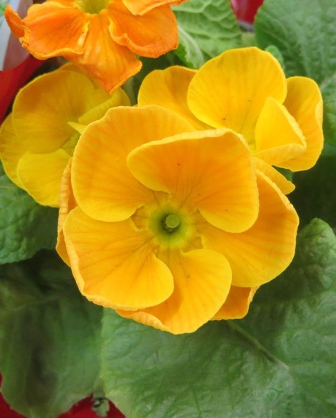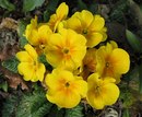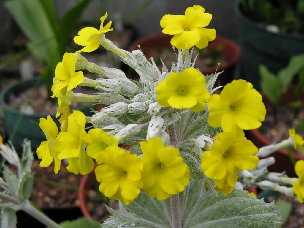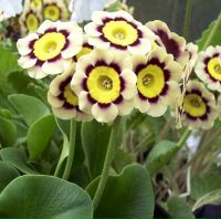 Примула ушковая. Обитательница альпийских склонов отращивает более плотные, овальные листья с гладкой, блестящей поверхностью и сероватым напылением. В центре листовой розетки находится цилиндрический стебель длиной до 20 см с плотным колосовидным соцветием из 6-7 желтых ароматных цветов.