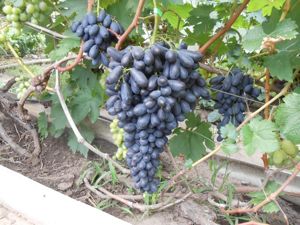 ΠΡΠΎΠ·Π΄ΠΈ Π²ΠΈΠ½ΠΎΠ³ΡΠ°Π΄Π° ΠΈΠΌΠ΅ΡΡ ΡΡΠ΅Π΄Π½ΠΈΠ΅ ΡΠ°Π·ΠΌΠ΅ΡΡ, Ρ ΠΎΡΡ Π΅ΡΡΡ ΠΈ Π΄ΠΎΡΡΠ°ΡΠΎΡΠ½ΠΎ ΠΊΡΡΠΏΠ½ΡΠ΅ Π²Π°ΡΠΈΠ°Π½ΡΡ Ρ Π½Π΅ΡΠΊΠΎΠ»ΡΠΊΠΈΠΌΠΈ ΠΎΡΠ²Π΅ΡΠ²Π»Π΅Π½ΠΈΡΠΌΠΈ. Π―Π³ΠΎΠ΄ΠΊΠΈ ΠΏΠ»ΠΎΡΠ½ΠΎ ΠΏΡΠΈΠ»Π΅Π³Π°ΡΡ Π΄ΡΡΠ³Ρ ΠΊ Π΄ΡΡΠ³Ρ, ΡΠΎΡΠΌΠ° ΡΠΈΠ»ΠΈΠ½Π΄ΡΠΈΡΠ΅ΡΠΊΠ°Ρ. ΠΠ΅ΡΡ ΡΡΠΊΠ° ΠΊΠΈΡΠΌΠΈΡΠ° Π΄Π΅Π»ΠΈΡΡΡ Π½Π°Π΄Π²ΠΎΠ΅. ΠΠ»ΠΎΠ΄Ρ ΠΌΠ΅Π»ΠΊΠΈΠ΅, Π²ΡΡΡΠ½ΡΡΡΠ΅, ΡΠ²Π΅Ρ Π·Π°Π²ΠΈΡΠΈΡ ΠΎΡ ΡΠΎΡΡΠ° (Π΅ΡΡΡ ΠΆΠ΅Π»ΡΡΠ΅, ΡΠ½ΡΠ°ΡΠ½ΡΠ΅ ΠΈ Π΄Π°ΠΆΠ΅ ΡΠ΅ΠΌΠ½ΡΠ΅ ΡΠ³ΠΎΠ΄Ρ). ΠΠΎΠΆΠΈΡΠ° ΠΏΠΎΡΡΠΈ ΠΏΡΠΎΠ·ΡΠ°ΡΠ½Π°Ρ, ΡΠ²Π΅ΡΡΡ, Π»Π΅Π³ΠΊΠΎ, ΠΏΠΎΠΊΡΡΡΠ° Π²ΠΎΡΠΊΠΎΠ²ΡΠΌ Π½Π°Π»Π΅ΡΠΎΠΌ. ΠΠΊΡΡ ΡΠ»Π°Π΄ΠΊΠΈΠΉ, ΠΏΡΠΈΡΡΡΡΡΠ²ΡΠ΅Ρ Π»Π΅Π³ΠΊΠ°Ρ ΠΊΠΈΡΠ»ΠΈΠ½ΠΊΠ°.