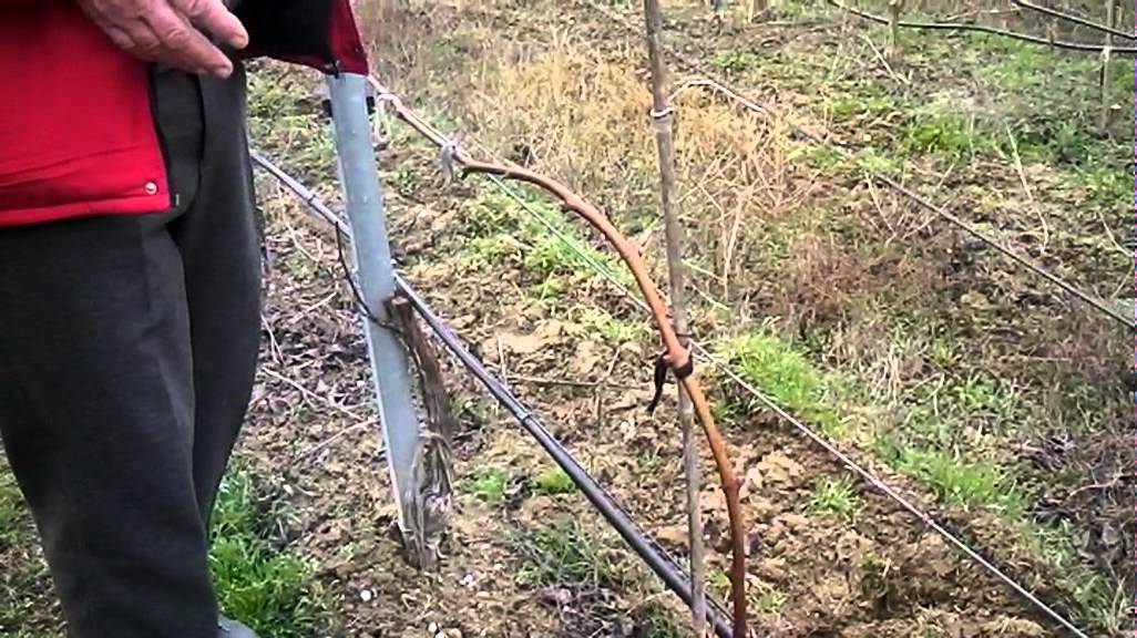 На главном побеге (стебле) удалите все лианы, кроме двух верхних. Каждую из них разрежьте на 2 глаза и привяжите к шпалере, направив в разные стороны. Отросшие за лето 4 побега осенью обрежьте следующим образом: нижние побеги с каждой стороны разрежьте на 2 глазка (это будут замещающие узлы), а верхние — до 5-15 глазков (это будут плодоносящие стрелки).