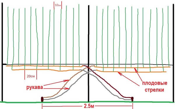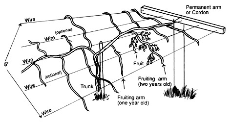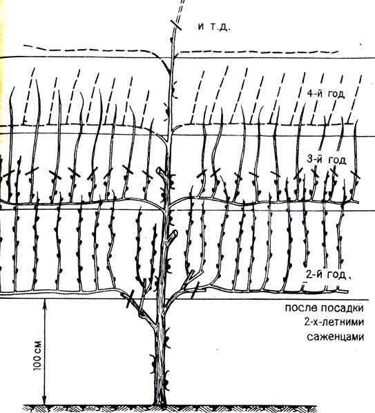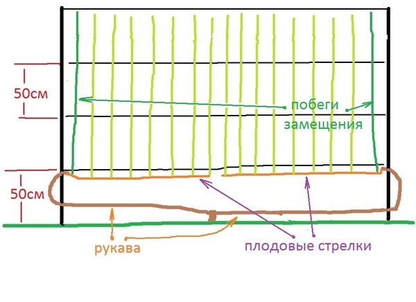 Туловище тренируется до необходимой высоты и развиваются два боковых плеча. Все побеги, развивающиеся из этих двух основных ветвей, зимой обрезают до 8-12 глазков, а основные ветви оставляют короткими.