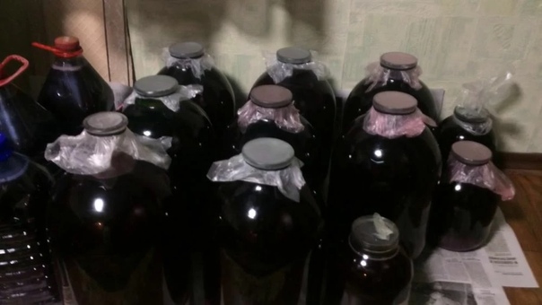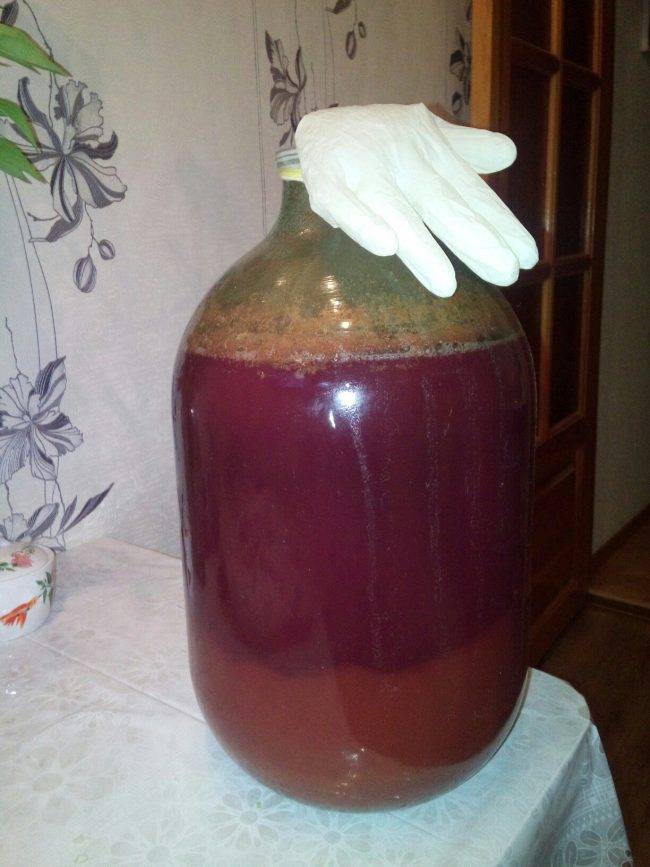 Наливаем в бутыль 10 литров сока, полученного в шаге №4. Берем 10 литров теплой воды, чтобы можно было держать там руку. Добавляем 3-3,5 килограмма сахара и смешиваем с нашим соком. Одеваем на банку или бутыль рукавицу и делаем надрез. Спустя 14-16 дней снимаем рукавицу и закрываем обычной крышкой и ждем 30-50 дней (в зависимости от температуры) до выпадения полностью осадка и проявления красивого цвета вина. Открываем крышку, и аккуратно разливаем по бутылкам, осадок на дне не трогаем. Вот так просто сделать домашнее вино самому, примерно 16% об.