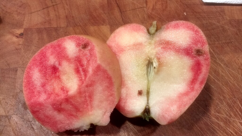 В зависимости от того, где вы получаете Pink Pearl, цвет внутри может быть более интенсивным или менее интенсивным. Первые яблоки Pink Pearl, которые у меня были, были очень темными внутри, скорее красными, чем розовыми.