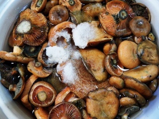 - Вымачивание. Это — один из главных этапов подготовки к засолке: без замачивания невозможно убрать горечь. Вымачивать придется долго — не меньше двух дней. Грибы нужно сложить в эмалированную емкость, залить отфильтрованной водой. Жидкости потребуется много — на 5 см выше шляпок. Воду для вымачивания необходимо подсолить. Если в дальнейшем планируется засолка холодным способом, то воду еще и обязательно подкисляют.