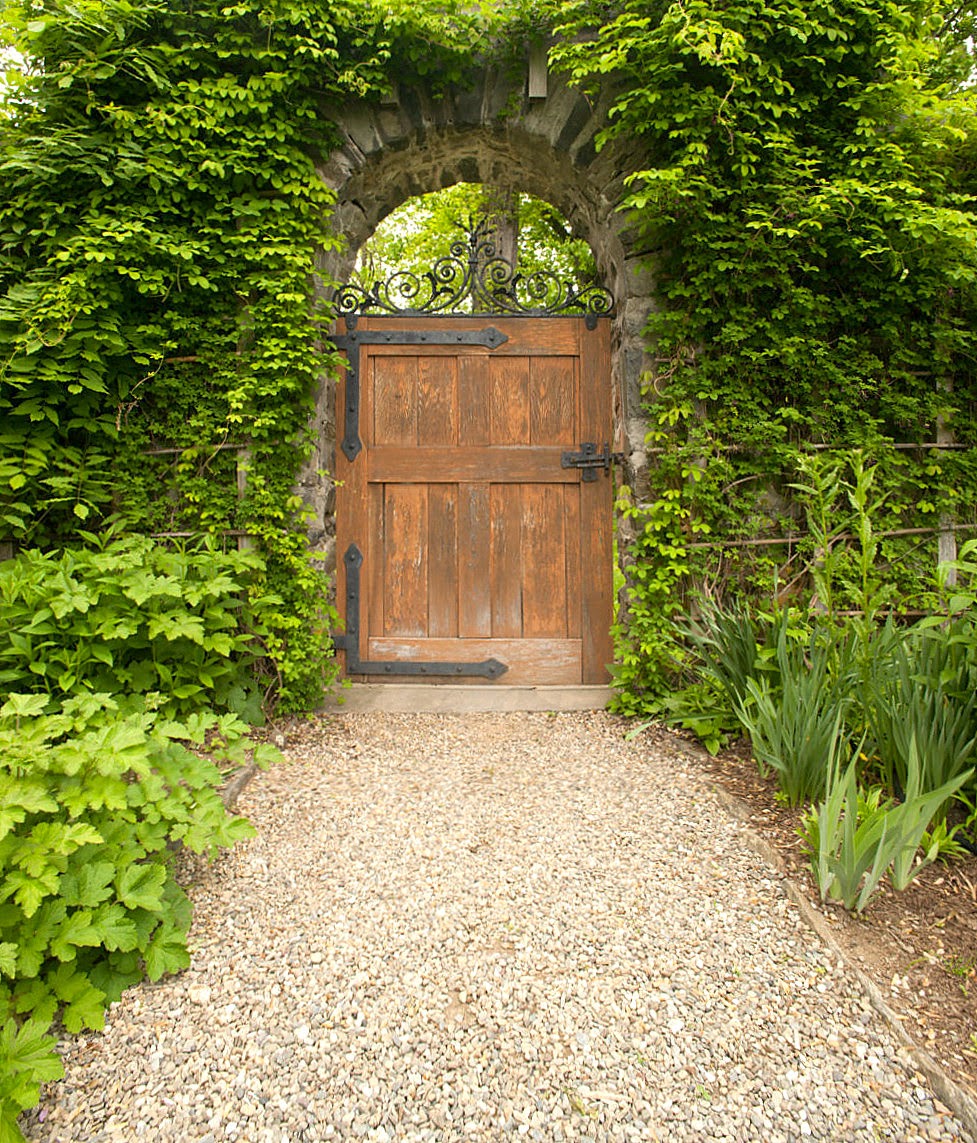 Иногда очень выигрышно смотрится сочетание массивного камня и легкой ажурной калитки. Поэтому если ваш участок огорожен каменным или кирпичным забором, устройте калитку прямо в ней как дверь в стене.