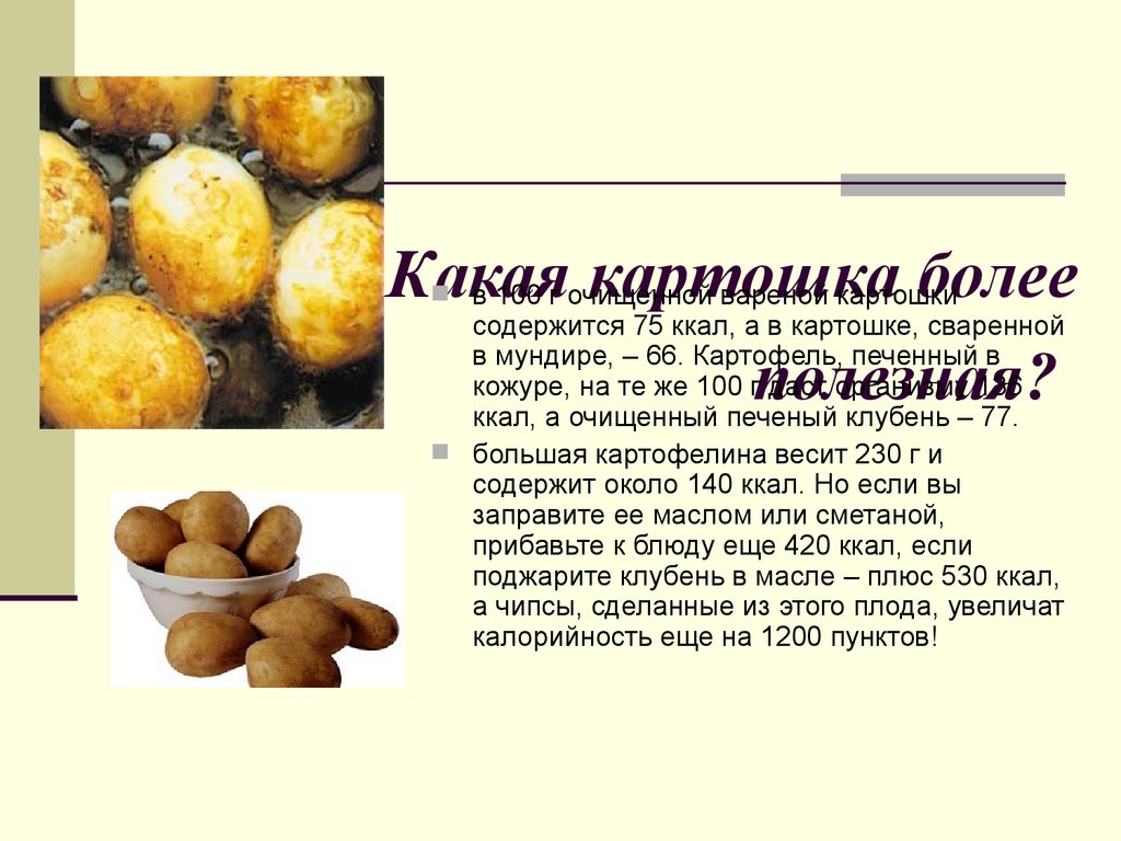 Однако растительное масло и сало для жарки, сливочное масло для пюре, майонез или сметана для запекания в духовке — очень жирные и калорийные ингредиенты, которые сильно увеличивают энергетическую ценность блюд из этого популярного овоща.