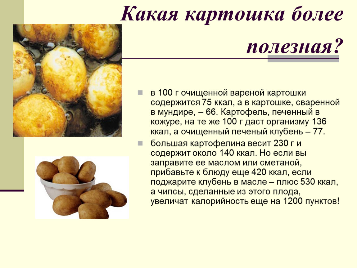 Но не следует забывать о том, что пользу можно извлечь только из правильно приготовленного картофеля. Запеченный с кожурой и пряными травами станет источником упомянутых выше нутриентов и «полезных» калорий и может быть подан как гарнир или самостоятельное блюдо. А вот обжаривание во фритюре с добавлением соли или сахара лишает картофель всей его питательной ценности, превращая в калорийный продукт с высоким содержанием вредных жиров и соли.