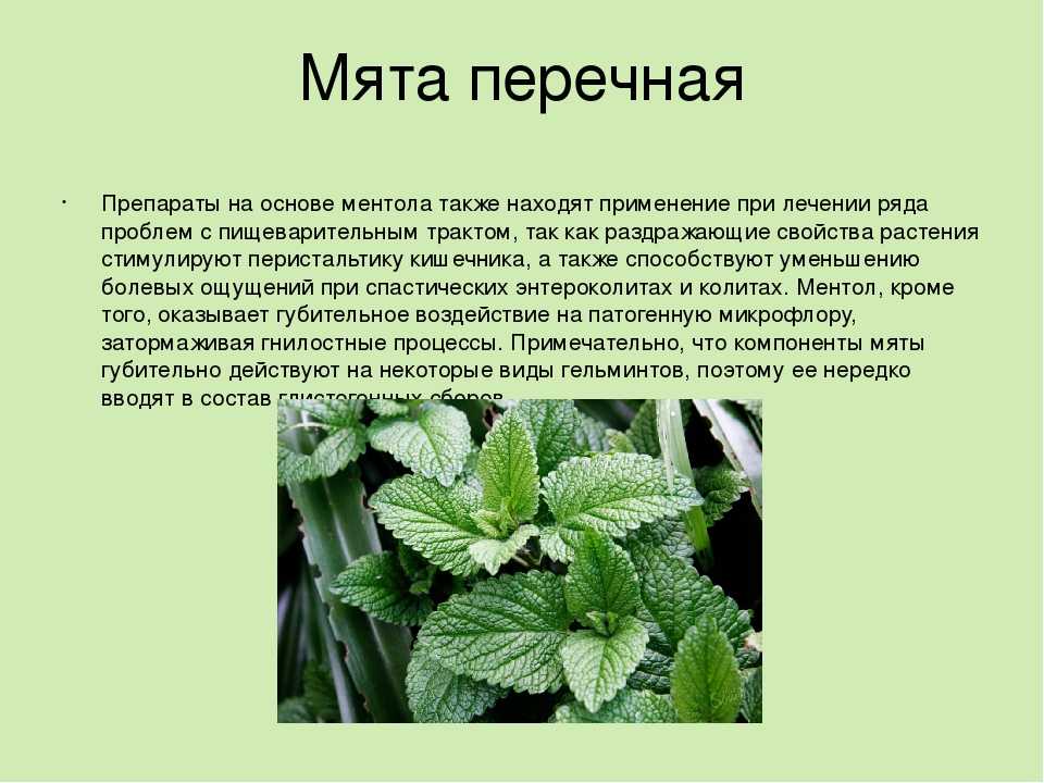 Из мяты готовят отвары и настойки, а ментол — отличный антисептик и хорошо проверенное противовоспалительное средство. Нередко в диетологии мяту используют как природный «сжигатель» жира. Если вам захотелось съесть пирожное, то достаточно выпить чашечку мятного чая, даже если вы сорветесь в конечном итоге, съедите меньше, чем планировали».