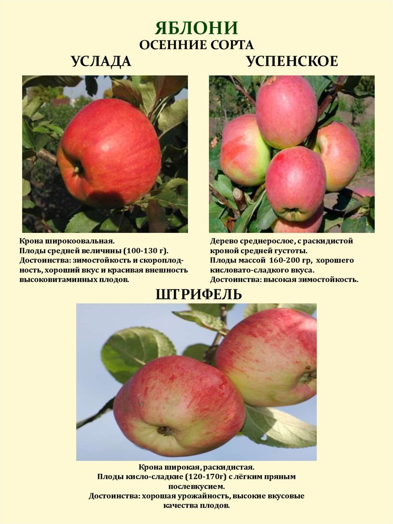 Осенние сорта яблонь занимают промежуточное место между группами летних и зимних сортов. И в самих плодах присутствуют отдельные качественные признаки, характерные как для ранних, так и поздних сортов.