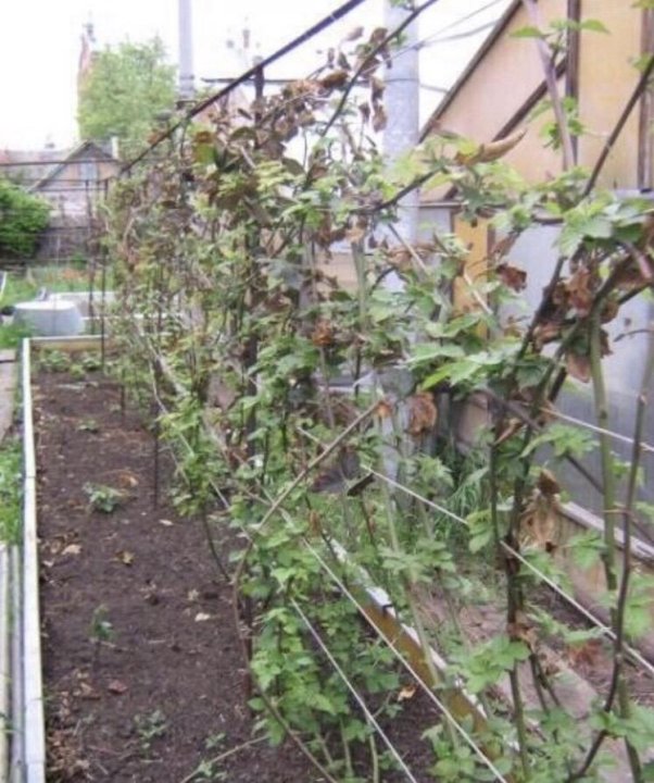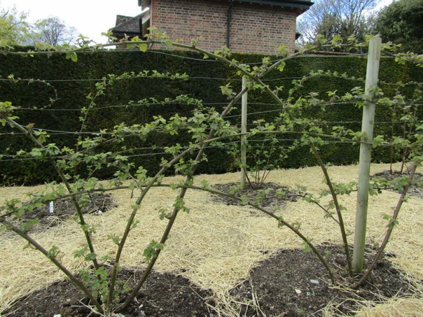 По мере роста нужно растения подвязывать к проволоке шпалеры. Как только молодые кусты отрастут на 40-к сантиметров, обложить их свежим навозом. Слой навоза должен быть не менее 10-ти сантиметров. Можно непосредственно к стволам кустов, так как они не боятся свежего навоза.
