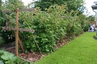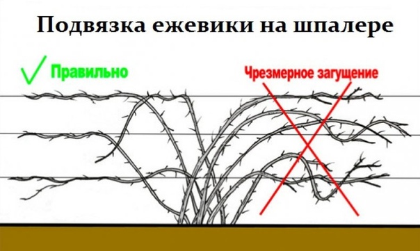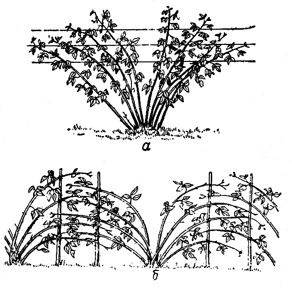 Для стелющихся форм ежевики необходима установка опор (шпалер). Самый простой способ установить опору – это вбить длинный колышек и подвязать к нему побеги, что часто и делают дачники. Однако для большой посадки требуется установка настоящих шпалер с проволокой, высотой до 2 м. Шпалера – наиболее удобная конструкция для стелющихся и полустелющихся сортов, так как значительно упрощает обрезку, формирование куста, сбор урожая, и, что немаловажно, помогает кусту сохранять компактность.