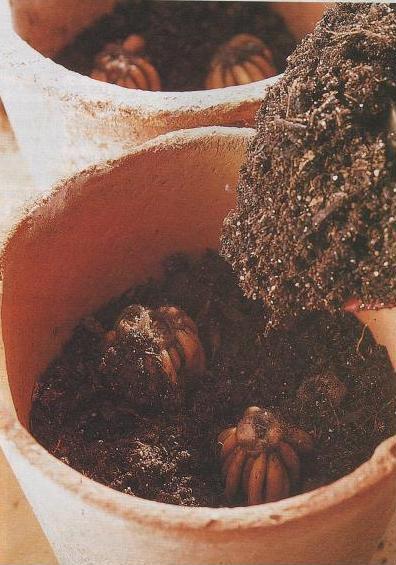 горшков на клубень или поместите несколько клубней в горшок побольше. - Поместите на дно почвенную смесь, затем клубень с загнутыми вниз корнями.