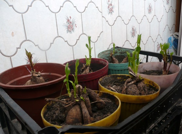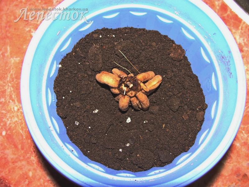 По окончании периода цветения и опадания листвы емкость с корневым клубнем нужно хранить в сухом, защищенном от света, месте в течение двух месяцев. В конце февраля – начале марта у растения начнет появляться надземная часть.