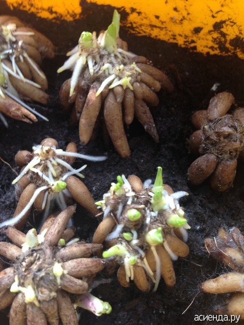 На подготовленном земельном участке можно заранее подготовить небольшие лунки на расстоянии около 20 сантиметров друг от друга. Высаживают по одному клубню (корешками вниз) в каждую лунку на глубину 4-5 сантиметров. Примерно через пару недель появятся первые всходы.