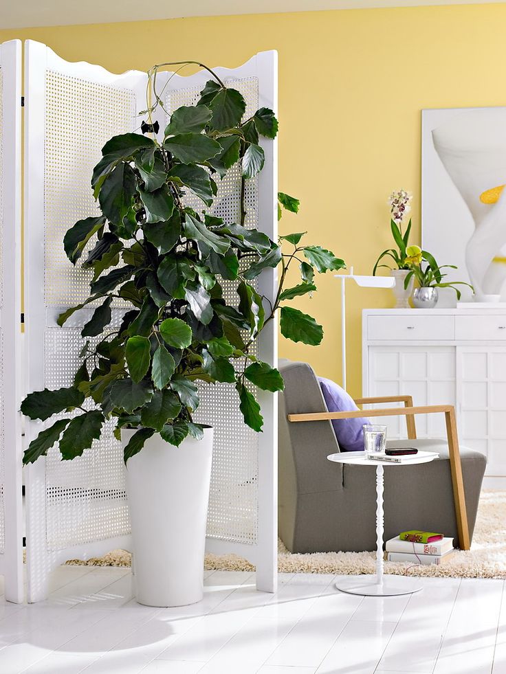 Комнатные растения могут быть не только декоративным элементом. Например, в горшках можно выращивать фикусы или декоративный бамбук. Эти полезные комнатные растения увлажняют воздух, выделяют кислород и поглощают вредные вещества. Выбирайте одно большое растение вместо нескольких поменьше. Очевидно, что комнатная пальма или лимон сразу обратят на себя внимание, в отличие от нескольких кактусов на подоконнике. Такие растения являются солитерами, которые не нуждаются в большой компании. Большой комнате необходимо большое растение.