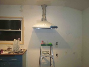 Если вы планируете делать на кухне подвесной гипсокартонный потолок, то часть воздуховода можно не скрывать, а пустить ее под обшивкой потолка.