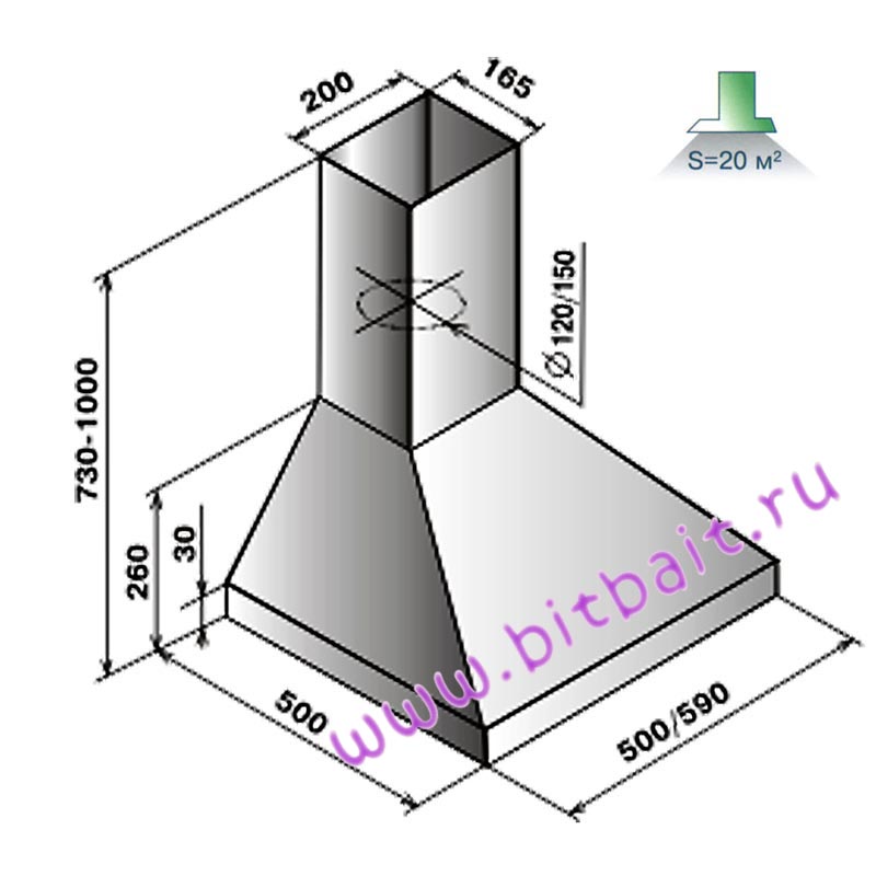 Жесткая рама короба собирается также из имеющегося оцинкованного профиля. Для упрощения работы непосредственно перед сборкой необходимо сделать подробный чертеж и выполнить расчет вытяжки для кухни. На чертеж следует нанести все размеры, чтобы не ошибиться в процессе изготовления.