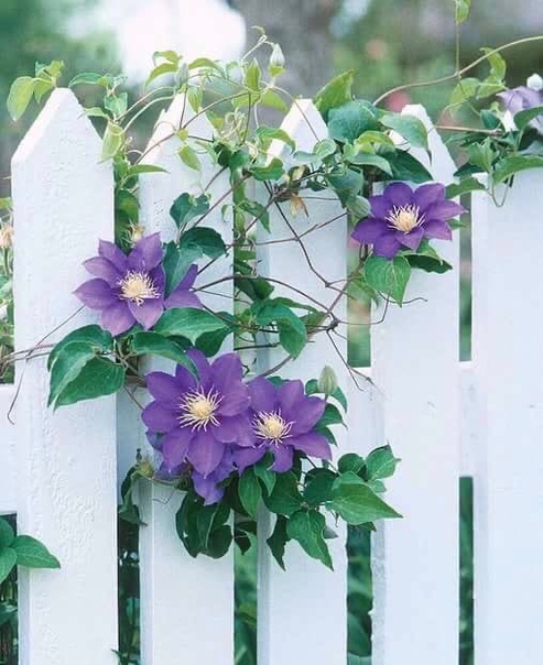 Это лианообразное растение украшают крупные цветки, и в период цветения клематис становится настоящим украшением участка. Способен плестись в высоту 5 метров, из него можно сделать самые разные композиции и фигуры. Прекрасно скроет неопрятную стену. Цветет до самых заморозков. Сажать лучше на хорошо освещенных территориях. Клематис не любит заболоченных участков. Поливать лучше редко, но обильно. При высадке на северных и ветреных территориях может погибнуть. Относится к долговечным растениям, поскольку может прожить на одном месте 20 лет.