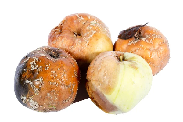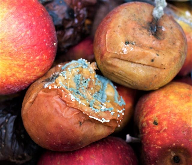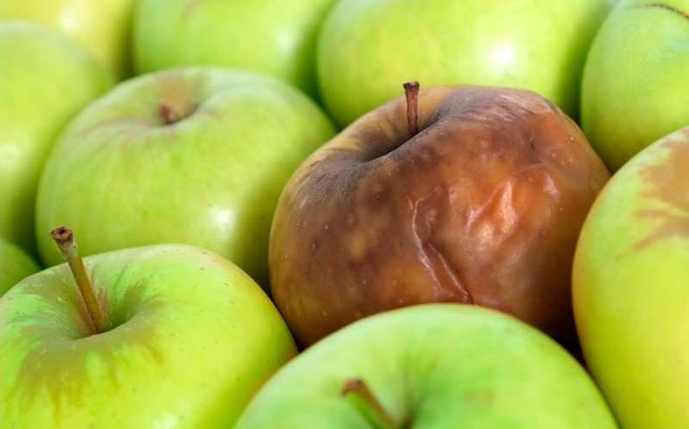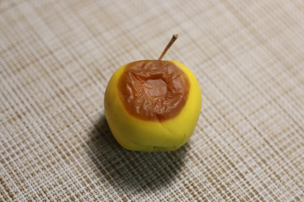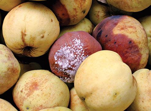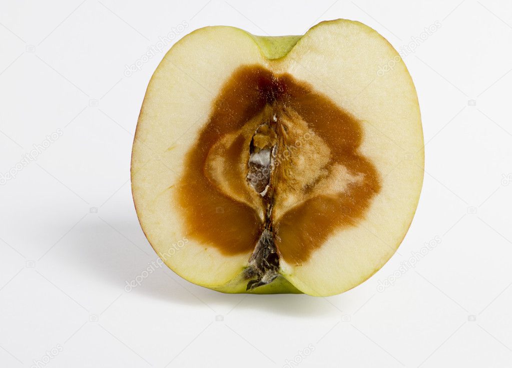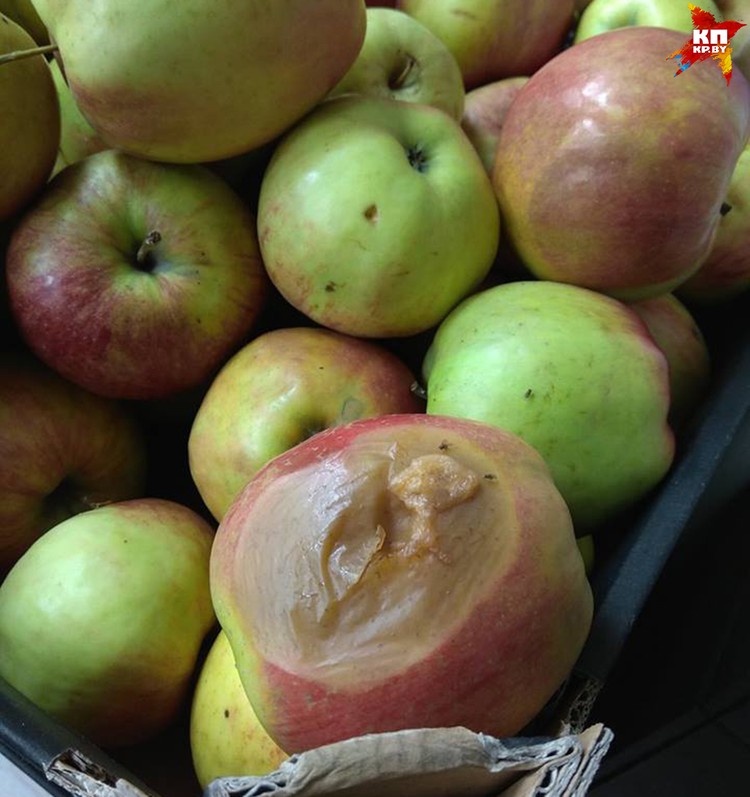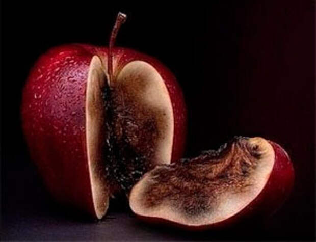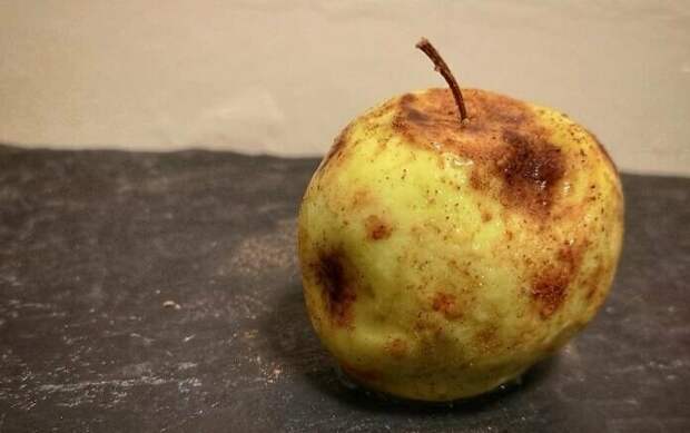 Некоторыми общими чертами плохих яблок являются зернистая, мягкая внутренняя часть и морщинистая кожура, а также обесцвечивание и синяки.