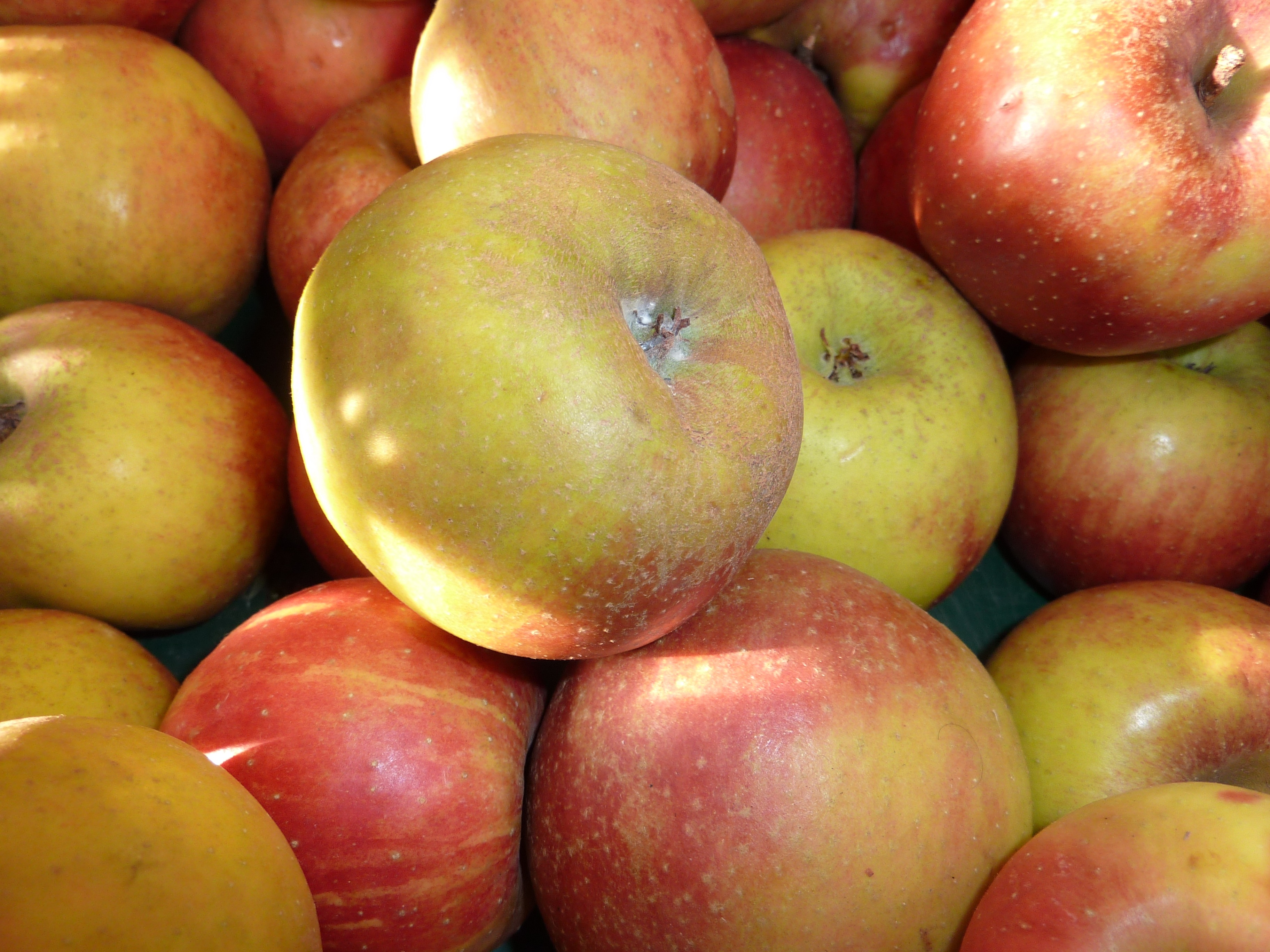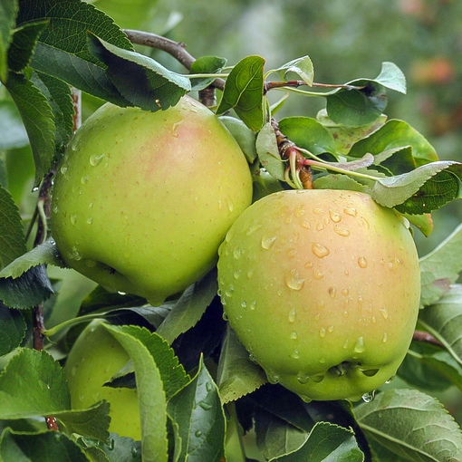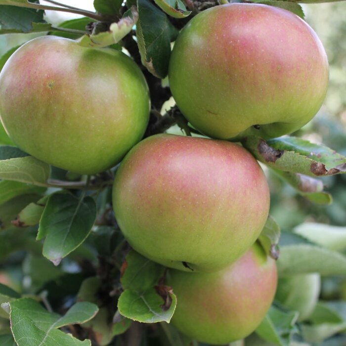Среднего размера, неправильной круглой формы, это зеленое яблоко с красным пятном и белой сочной мякотью.Слегка терпкий, со сладостью по мере созревания. Отлично подходит для соусов, пирогов или употребления в свежем виде.
