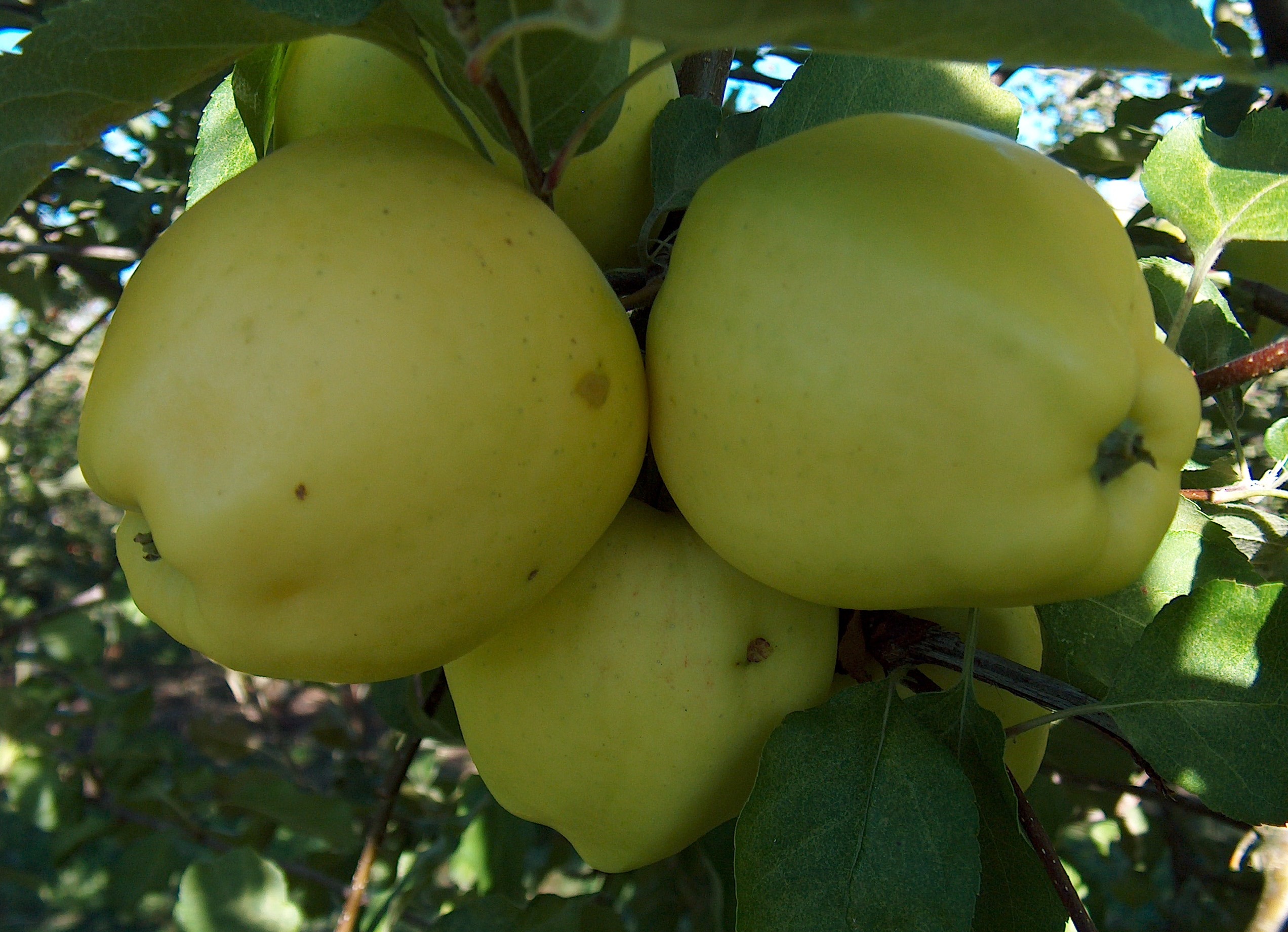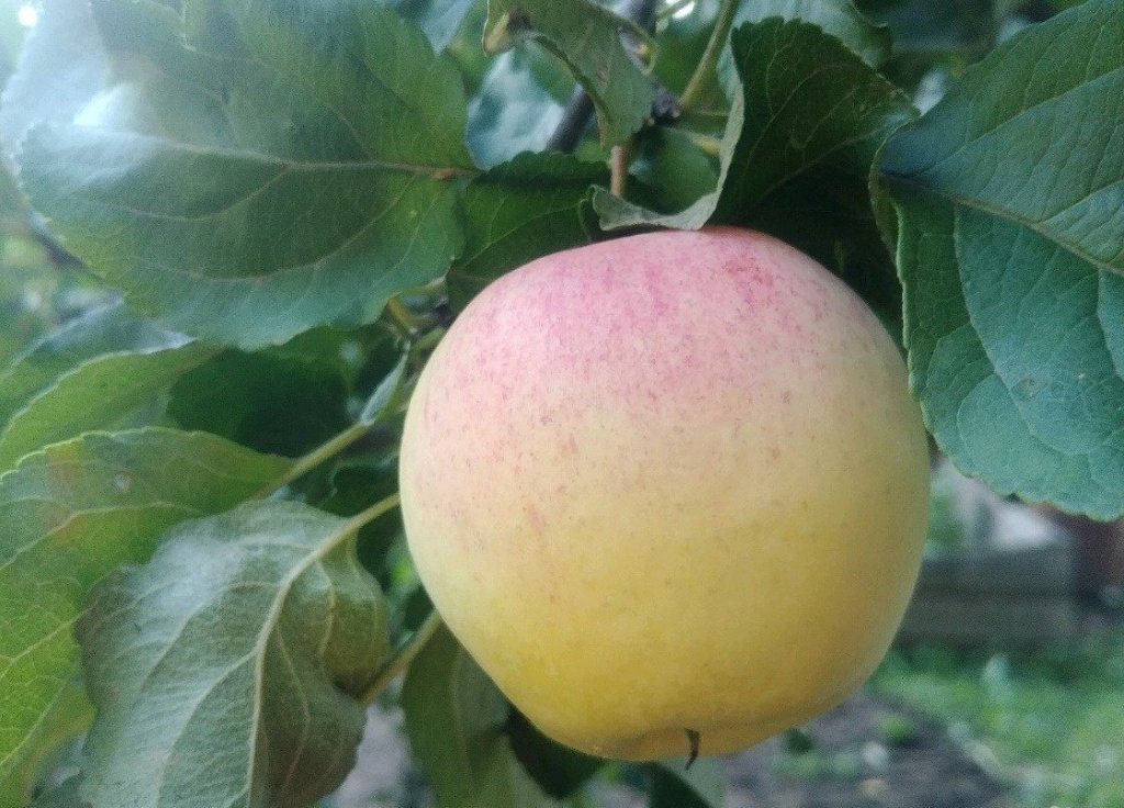 «Синапчик». Плоды созревают в середине сентября довольно крупные массой до 70г, желто-зеленые с красным румянцем.
